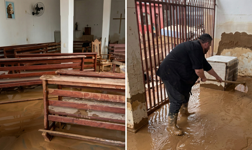 Capela em Ubá (MG) fica submersa após fortes chuvas, e hóstias consagradas são encontradas secas dentro do sacrário.
