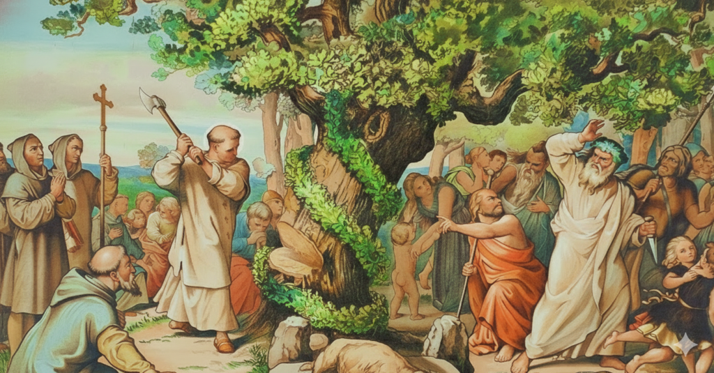 Ao montar a árvore de Natal, as famílias têm a oportunidade de transformar um gesto comum — muitas vezes reduzido ao brilho das luzes e à escolha das bolas coloridas — em um momento de transmissão de fé. A tradição cristã da árvore remonta à história de São Bonifácio, o grande missionário do século VIII, enviado para evangelizar os povos germânicos. Segundo a tradição, ele encontrou aldeias que ofereciam sacrifícios ao carvalho sagrado do deus Thor. Para mostrar que apenas o Deus vivo merecia adoração, Bonifácio derrubou o carvalho diante de todos. Quando a árvore caiu, um pequeno pinheiro permaneceu intacto, ereto entre os galhos quebrados. Bonifácio tomou aquilo como um sinal providencial: o pinheiro, sempre verde mesmo no rigor do inverno, seria uma imagem perfeita de Cristo, que permanece vivo para sempre.